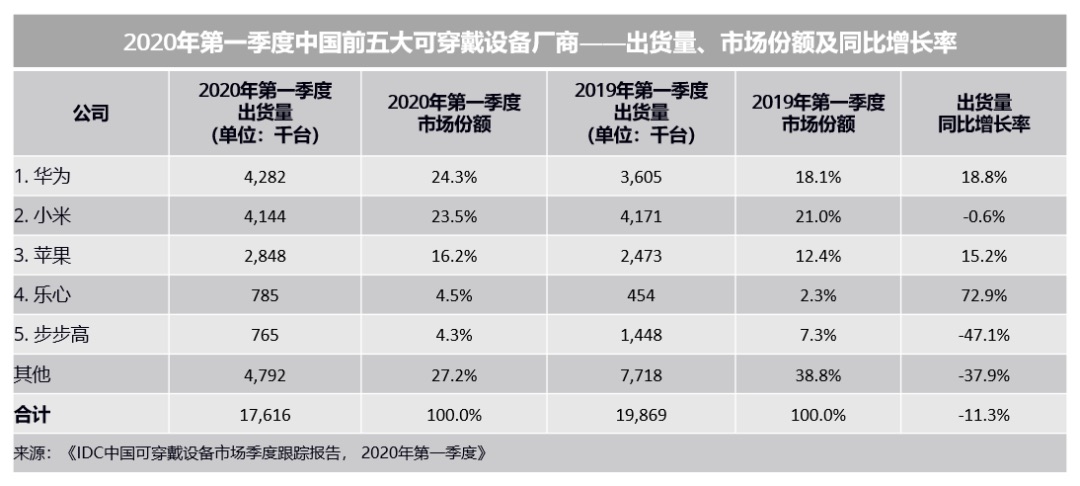 》显现,2020 年第一季度我国可穿戴设备商场出货量为 1762 万台,同比下降 11.3%。根底可穿戴设备(不支持第三方使用的可穿戴设备)出货量为 1486 万台,同比下降 5.5%,智能可穿戴设备出货量为 276 万台,同比下降 33.3%。陈述显现,华为凭仗途径运营才能和产品商场号召力,在手表商场上的表现特别稳健,协助其逆势增加,跃居我国可穿戴商场第一位。小米出货量同比稍微下滑,首要来自于小米手环在疫情期间供应链罢工和需求缺乏的两层压力。苹果虽然在手表和耳机上遭到必定程度影响,因处在快速上升时期,同比仍然可以坚持必定增加。乐心依托手机厂商的手环订单,出货规划大幅增加。步步高旗下的小天才儿童手表遭到疫情影响较为严峻,儿童户外活动的约束导致需求锐减。